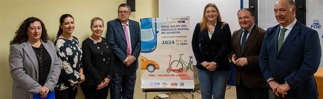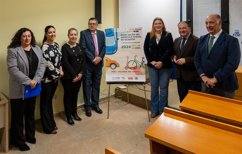 El vicepresidente de la FOE, Antonio Gemio, acompañado por el presidente de la Diputación de Huelva, David Toscano; la diputada de Igualdad y familia de ese organismos supramunicipal, Mar Martín; la alcaldesa de Valverde del Camino, Syra Senra y su concejala de Desarrollo Local, Eva Arroyo; el titular de la Asociación de Automoción de Valverde del Camino, José Manuel Taboada, han presentado hoy el XXIII Salón del Vehículo Nuevo, de Ocasión y Movilidad Sostenible que se celebrará en dicha localidad del 11 al 14 abril, donde se espera superar los visitantes de ediciones anteriores que alcanzaron unas 5.000 personas.