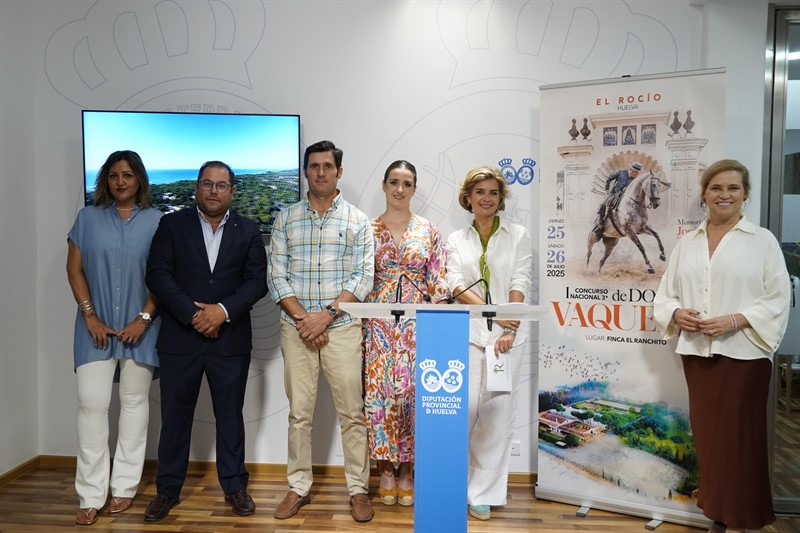 La finca El Ranchito, en El Rocío, acoge los días 25 y 26 de julio el I Concurso Nacional 3 Estrellas de Doma Vaquera, ‘Memorial José Tirado’. La prueba, que se ha presentado hoy en la Diputación de Huelva, reunirá a treinta binomios (jinete y caballo), quienes competirán por más de 7.000 euros en premios. La diputada de Cultura, Gracia Baquero, la concejala de Almonte, Ana Saavedra, así como Francisco Marín y Pepa Raso, propietario y directora comercial de El Ranchito, respectivamente, han presentado este Concurso Nacional de Doma Vaquera que prevé congregar a más de 4.000 espectadores.