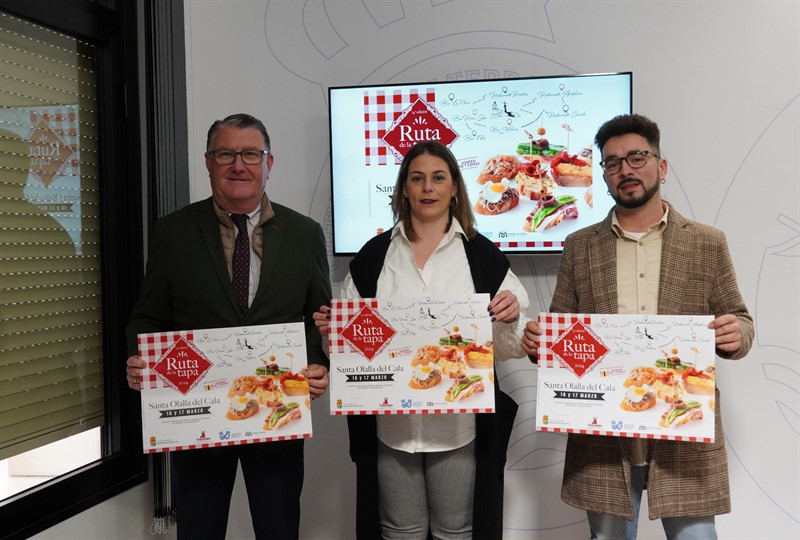 El vicepresidente de la Diputación de Huelva, José Manuel Zamora, acompañado por la alcaldesa de Santa Olalla, Asunción Ríos, y el concejal de Cultura, Turismo, Fiestas y Participación Ciudadana, Ángel Díaz, han presentado el cartel y la programación de la 14ª edición de la Ruta de la Tapa, evento que se desarrollará en la localidad serrana los días 16 y 17 de marzo en torno a la gastronomía de la localidad.