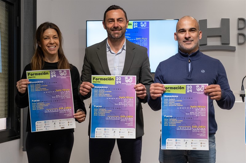 Desde el servicio de Deportes de la Diputación de Huelva se han programado cuatro cursos o jornadas de formación sobre fuerza, suelo pélvico, biomecánica y el uso del desfibrilador semiautomático que se van a desarrollar por toda la provincia y que comenzarán el próximo sábado, 24 de febrero, con una acción formativa sobre biomecánica en Almonte. El diputado de Deportes, Juan Daniel Romero, ha presentado estas acciones junto a José Pérez y Pilar Gudiel, dos de los monitores que van a impartir estas acciones dirigidas a entrenadores, monitores y técnicos deportivos de la provincia de Huelva.