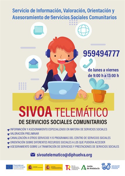 La Diputación de Huelva, a través de los Servicios Sociales Comunitarios, pone en marcha desde hoy, lunes, 17 de junio, una nueva modalidad telemática en la prestación del servicio de información, valoración, orientación y asesoramiento (SIVOA), un servicio esencial como puerta de acceso a todo el Sistema Público de Servicios sociales de Andalucía, garantizado por la Ley de Servicios Sociales de Andalucía, que se ofrece en las dependencias de los centros de servicios sociales comunitarios de las diferentes Zonas Básicas de Servicios Sociales, que constituyen el mapa andaluz de Servicios Sociales.