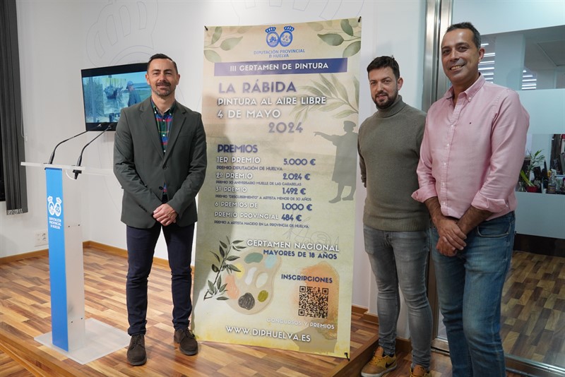 El diputado de la Unidad de Gestión de La Rábida, Juan Daniel Romero, y el comisario del certamen, Carlos Dovao, han dado a conocer las singularidades de “un evento que alcanza su tercera edición y que, como en anteriores años, está dotado de varios premios en metálico por valor de 15.000 euros repartidos en diferentes categorías, estando el primer premio, dotado con 5.000 euros, entre los 3 premios de pintura con mayor cuantía económica de España”, como ha indicado el diputado.