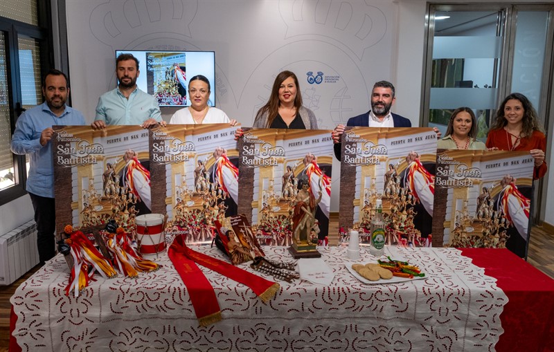 La vicepresidenta de la Diputación, Rocío Moreno; el alcalde de Alosno, Francisco José Suero; la hermana mayor de la Hermandad de San Juan Bautista de Alosno, Lucía Salguero; el técnico de Cultura, Pedro Juan Macías; y distintos miembros de la Junta de Gobierno de la Hermandad de San Juan Bautista, han presentado las Fiestas Patronales en honor a San Juan Bautista, patrón de Alosno, que dan comienzo hoy, 13 de junio, y se extienden hasta el 24, “día en el que San Juan Bautista recorrerá a hombros de alosneros las calles de Alosno, acompañado en todo momento de la ancestral danza de sus fervientes cascabeleros”, como ha indicado la vicepresidenta.
