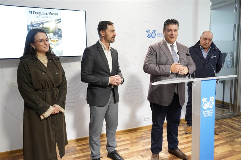 El municipio de Villarrasa celebrará el próximo 22 de noviembre la sexta edición de su Feria del Mosto, una cita que se consolida como una de las más esperadas del calendario otoñal en el Condado de Huelva. La presentación del evento ha tenido lugar hoy en la Diputación de Huelva, con la presencia del diputado provincial Juan Daniel Romero; el alcalde de Villarrasa y diputado de Medio Ambiente, Arturo Alpresa; el presidente de la Cooperativa del Campo Nuestra Señora de los Remedios, José Iglesias; y la concejala de Festejos y Deportes del Ayuntamiento de Villarrasa, Estefanía Martín.