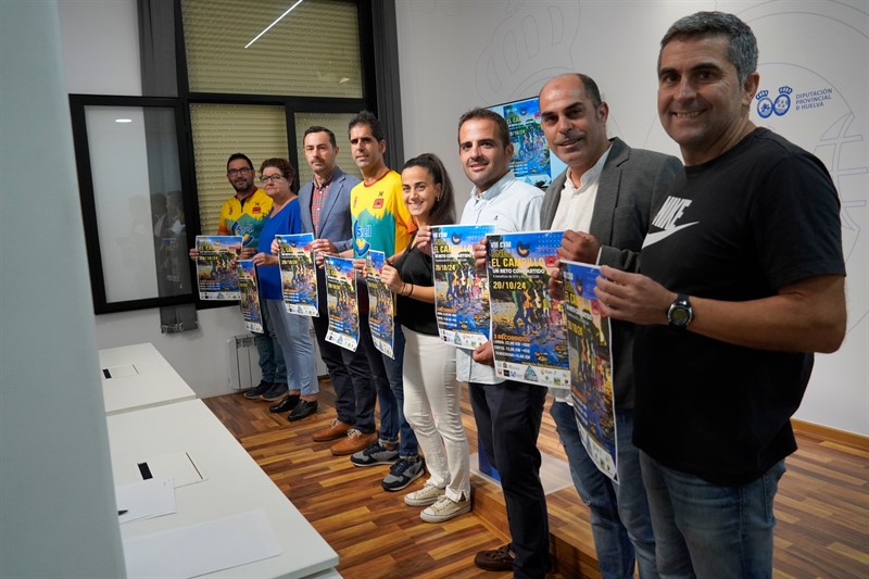 El diputado de Deportes de la Diputación de Huelva, Juan Daniel Romero, junto a la concejala de Deportes del ayuntamiento de El Campillo, Paloma Viega; el tesorero del Club Trail Running El Campillo, Luis Fernando Romero; el vocal del Club Trail Running El Campillo, Daniel Fernández; el CEO de SNELL Cuenca Minera, Miguel González; el director de AFA El Campillo, Francisco José Baquero; la presidenta de Acamacum, Bernarda López; y el coordinador deportivo del Ayuntamiento de El Campillo, Fernando Pineda, han presentado hoy esta prueba que contará con tres distancias. Una de 13 kilómetros y un desnivel positivo de 450 metros; una segunda, más exigente, de 22 kilómetros con un desnivel positivo de 900 metros, por el campo y senderos; y una tercera, de senderismo con una distancia de 10 kilómetros. El diputado de Deportes, quien ha agradecido la colaboración de las empresas privadas en el desarrollo de esta prueba, ha animado a la participación de un evento que “pone de manifiesto una vez más el vínculo entre deporte y solidaridad para ayudar a los que más lo necesitan”.