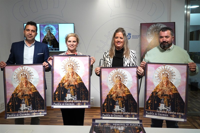 Esta mañana se han presentado el cartel anunciador y los actos de la Semana Santa 2024 de Puebla de Guzmán. La diputada de Cultura, Gracia Baquero; el secretario de la Asociación María Auxiliadora, José Tomás Paulino; la vocal de la Asociación, Mónica Acevedo; y el autor del cartel anunciador, Miguel Ángel Díez, han dado a conocer los detalles de la Semana Mayor puebleña.