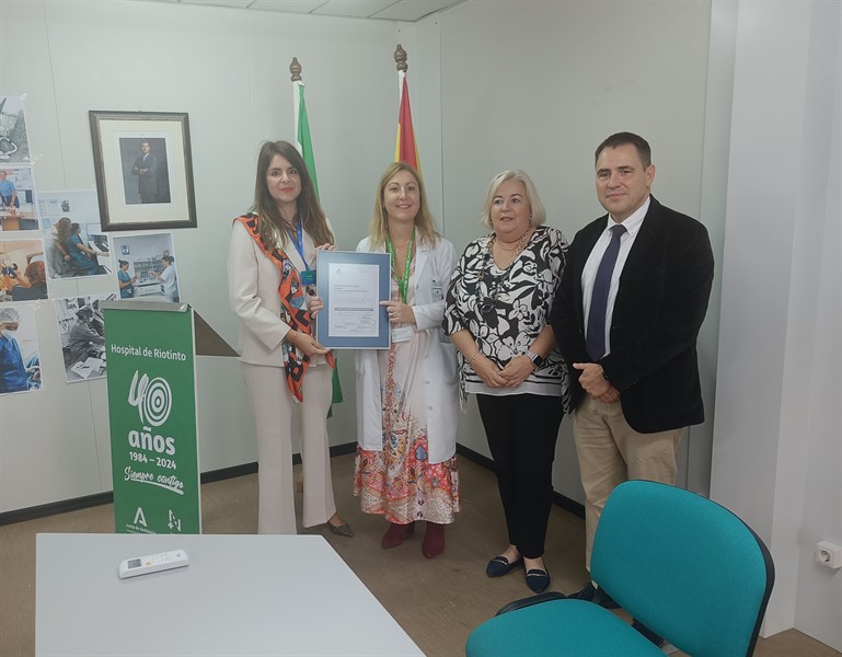 La entrega del distintivo, el primero de este tipo que consigue una unidad del centro, se ha celebrado en el propio hospital y ha contado con la presencia de la delegada territorial de Salud y Consumo, Manuela Caro; la directora gerente del área sanitaria, María Paz Pérez; el director de la ACSA, José Ignacio del Río; otros miembros del equipo directivo, y la responsable y profesionales de la unidad certificada.