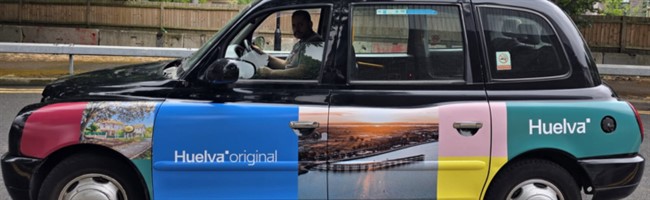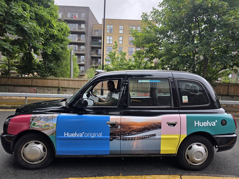 En cuanto a los taxis, la campaña consistirá en decorar durante más de dos meses el exterior en ambos lados de 15 taxis con diseños personalizados realizados por el Ayuntamiento de Huelva. Al igual que el exterior, el interior de los taxis estará decorado con dicho diseño, concretamente los asientos, las puertas y los recibos. La publicidad en taxis agrega a la campaña un alcance geográfico amplio y efectivo, especialmente en zonas céntricas de Londres. Este medio es de amplia popularidad entre los anunciantes que buscan captar audiencias de calidad, por sus largas horas de trabajo, áreas céntricas que cubren, el gran especio creativo disponible y su valor excepcional. Cabe destacar que, entre las empresas que frecuentan los taxis como espacio publicitario, encontramos empresas de inversión, hoteles de alta gama y marcas de moda de lujo.