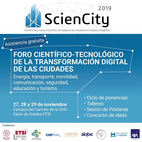La transformación digital en las ciudades inteligentes a través de la tecnología y la ciencia puede facilitar, aún más si cabe, el día a día de las personas. La Universidad de Huelva acogerá los días 27, 28 y 29 de noviembre las II Jornadas ScienCity 2019, un foro científico-tecnológico para el fomento de la cultura científica, tecnológica y de innovación en Ciudades Inteligentes.