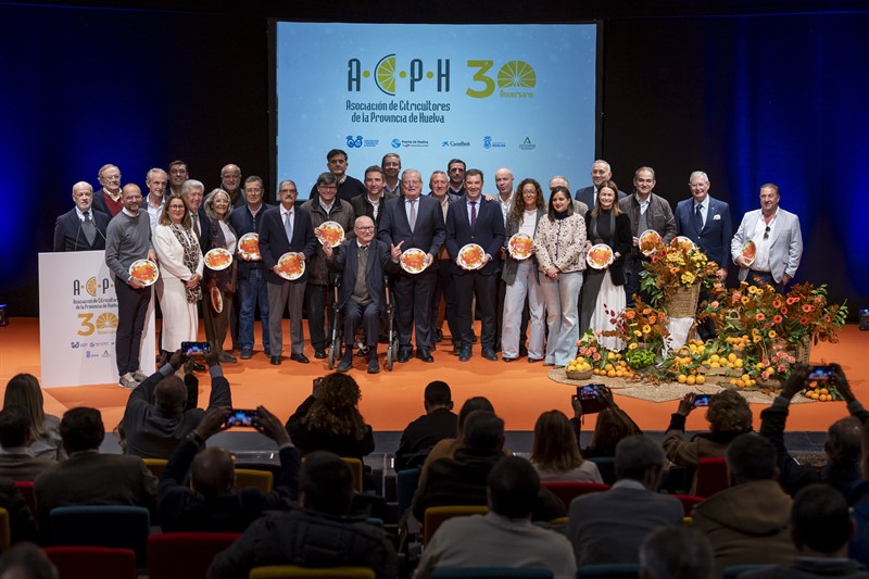 La Asociación de Citricultores de la Provincia de Huelva (ACPH) ha celebrado hoy en Las Cocheras del Puerto su acto conmemorativo por el 30 aniversario de su creación, una cita institucional y sectorial que ha reunido a representantes públicos, entidades del sector, empresas productoras y agentes sociales para poner en valor tres décadas de trabajo y avances en la citricultura onubense y reconocer y premiar a las personas e instituciones que han colaborado en este tiempo con la asociación.