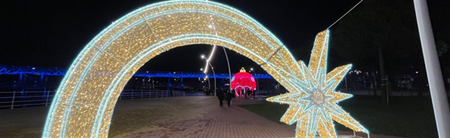 El Paseo de la Ría está adornado con 1.200 metros de guirnaldas led, situadas entre las farolas y luce cortinas de color blanco cálido en varias pérgolas, así como un paraguas con tiras led junto a la tercera pérgola. En paralelo, la Avenida Francisco Montenegro muestra arcos transversales iluminados con estrellas.