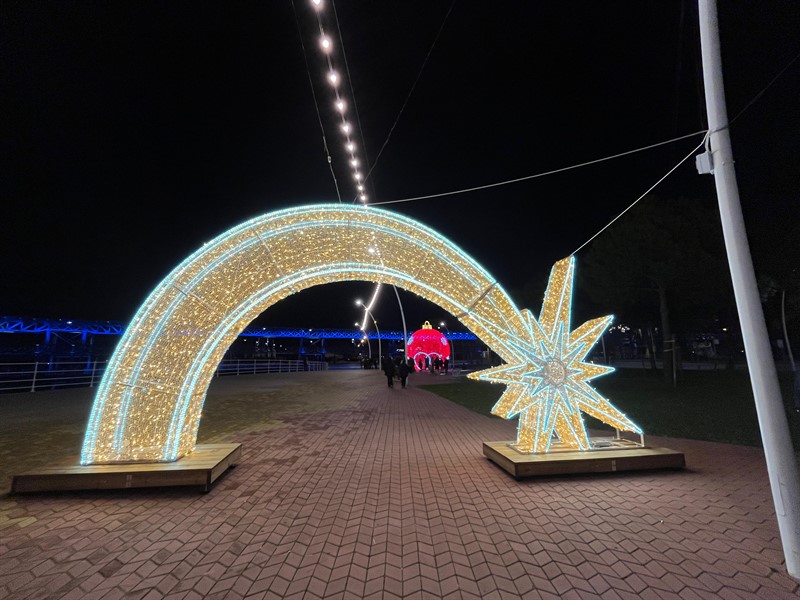 Una de las novedades más destacadas del alumbrado de este año es una gran Estrella de Oriente, situada junto a la primera pérgola del Paseo de la Ría. En este espacio también luce un pino led de 12 metros de altura decorado con copos. Otro elemento emblemático de la decoración navideña es una gran bola de color rojo de seis metros de diámetro.