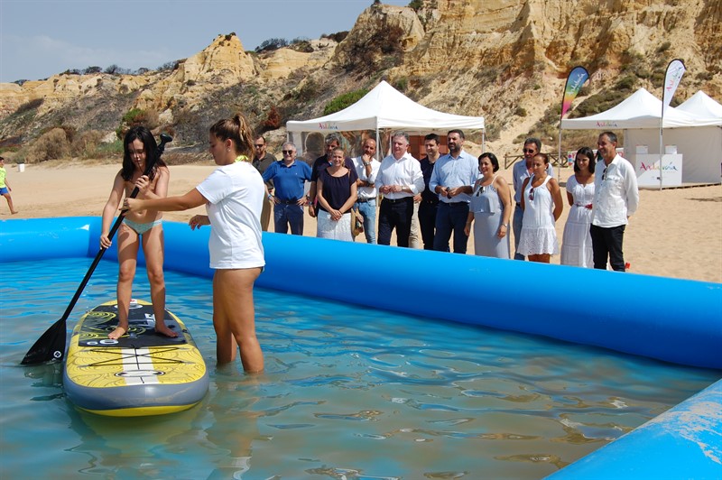 Así, se han instalado una serie de carpas en las que se ofrece información turística, la Ruleta de Andalucía con material promocional, actividades 3D, ludoteca infantil, escenario y pantallas de gran formato -que albergará animación y un concierto de Los 4 Fantásticos-, una piscina para practicar 'paddle surf', un campo de voley/badmington playa, y diversos soportes gráficos como lonas, photacall y banderolas.